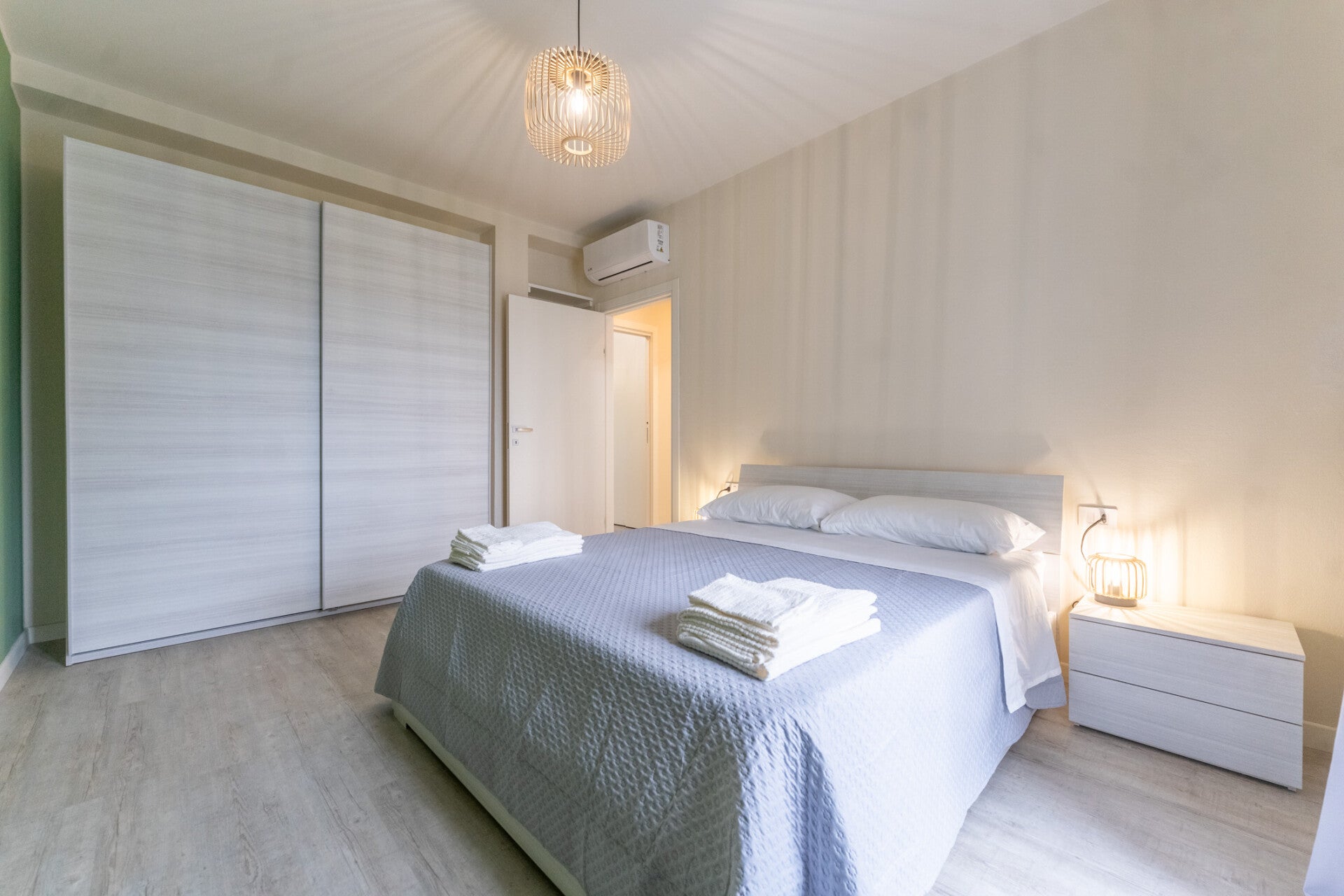 Camera matrimoniale luminosa e riservata, dai toni neutri e rilassanti, con letto king size e illuminazione soffusa. Comodini, lampade da lettura e un ampio armadio con ante scorrevoli (con ripiani e bastoni appendiabiti) completano l’arredamento, per un riposo rigenerante dopo una giornata in città.